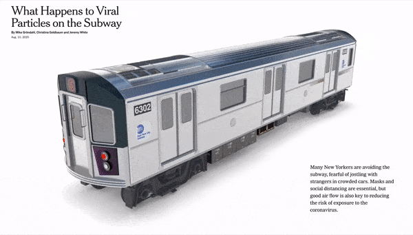 NYT treats stories like maps — they carefully guide the audience through the narrative, while introducing different elements into it as reference points. Every good map needs a legend, and NYT realizes this better than any other news outlet. And, like any other legend, it’s colour-coded. Look at the way they introduced different elements of the ventilation system, colour-coded them and provided visual illustration that is consistent, making it super easy and visual for the audience to follow the narrative.